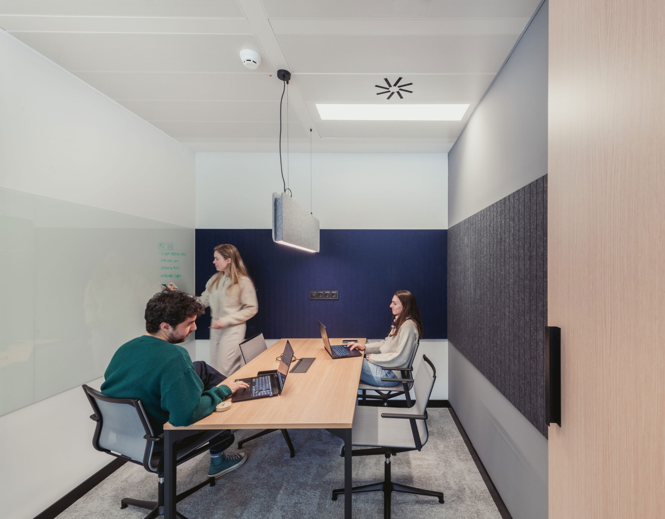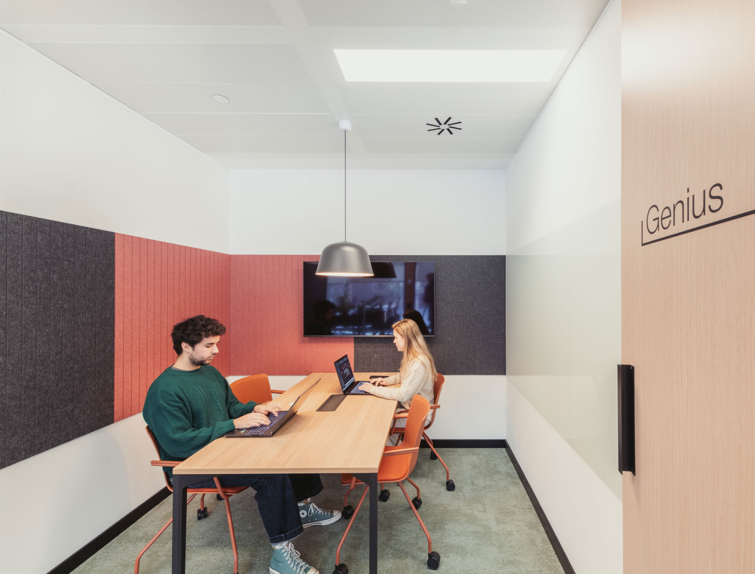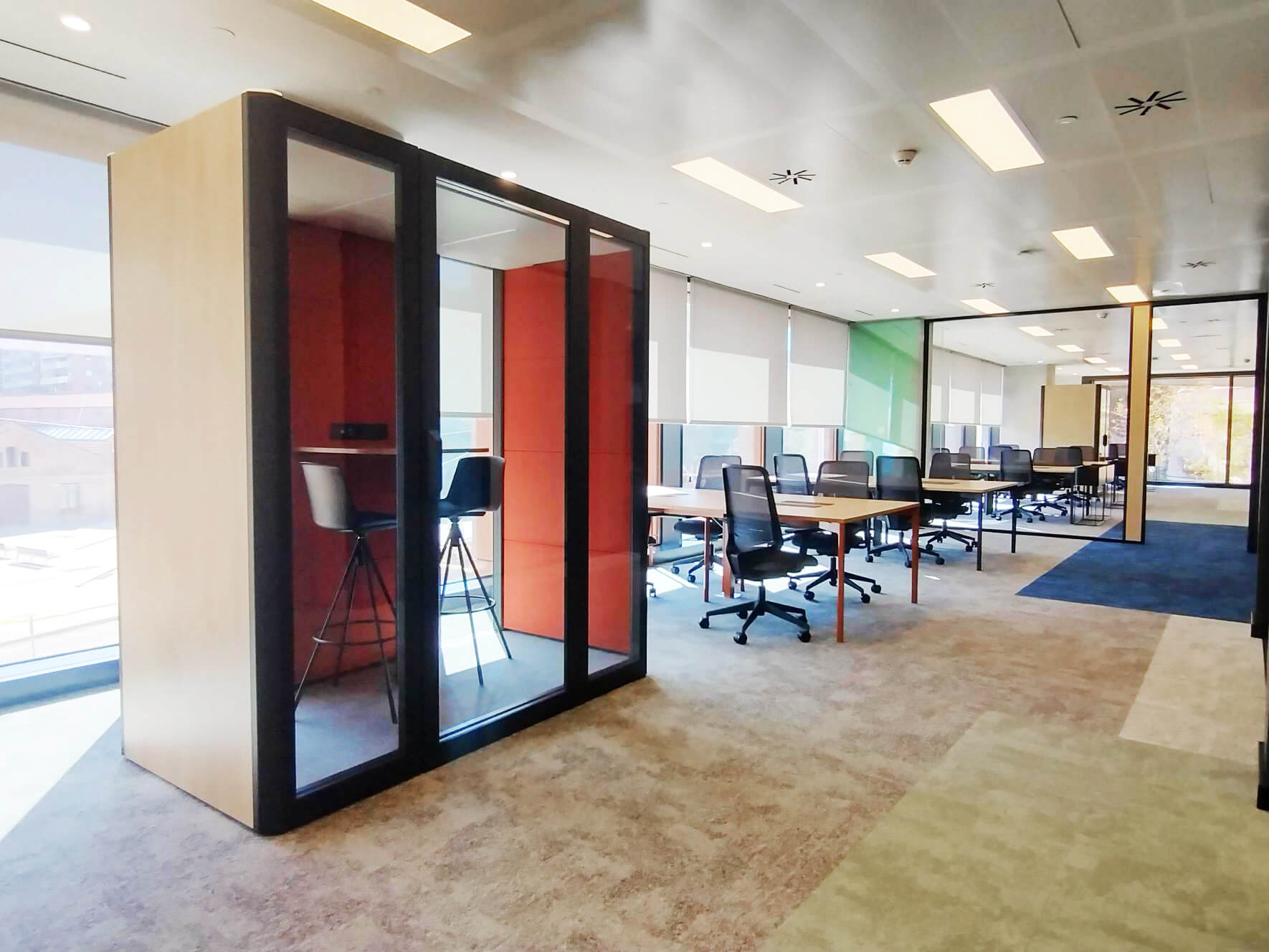 Phone booths cerrados y abiertos para reuniones pequeñas o colaborativas.