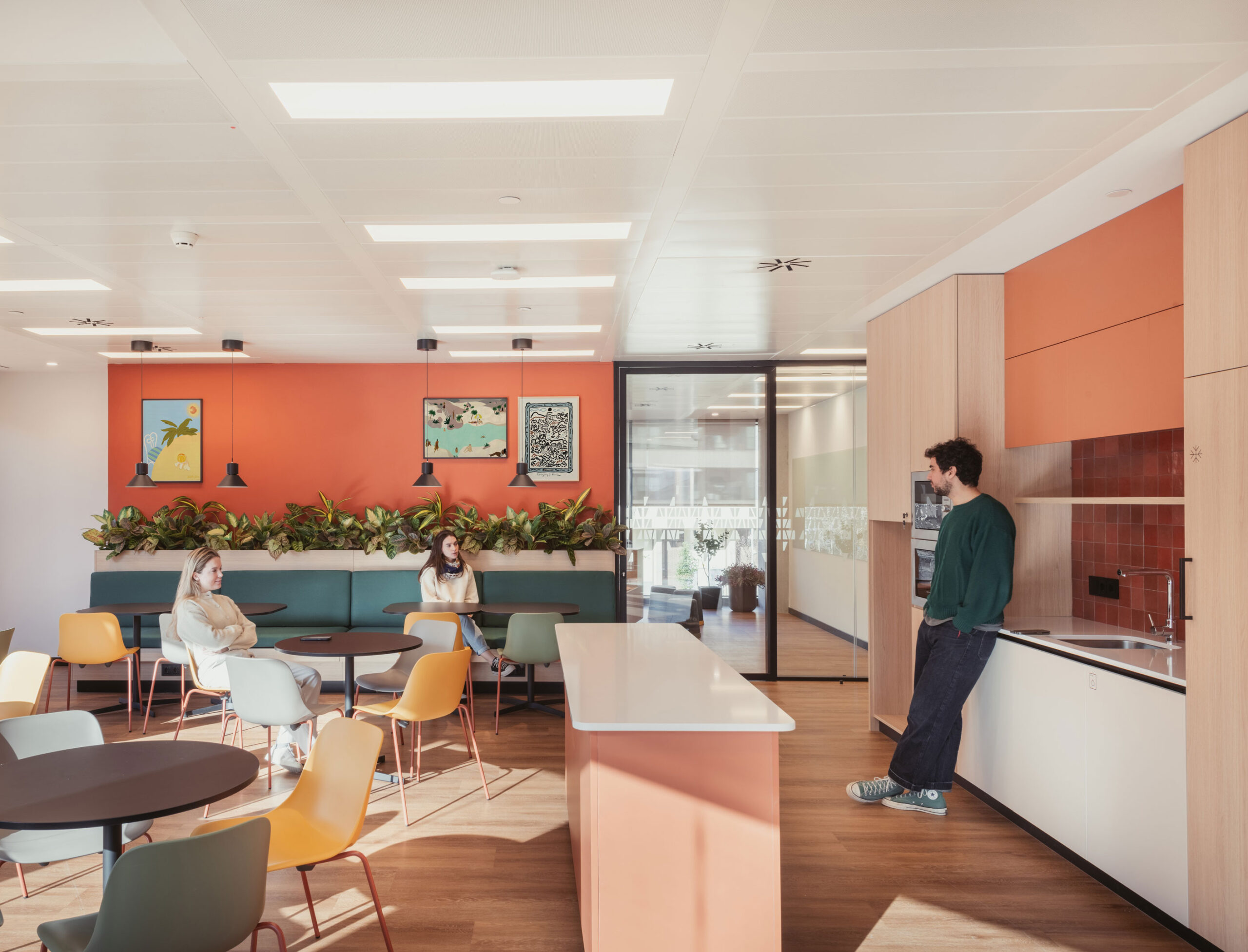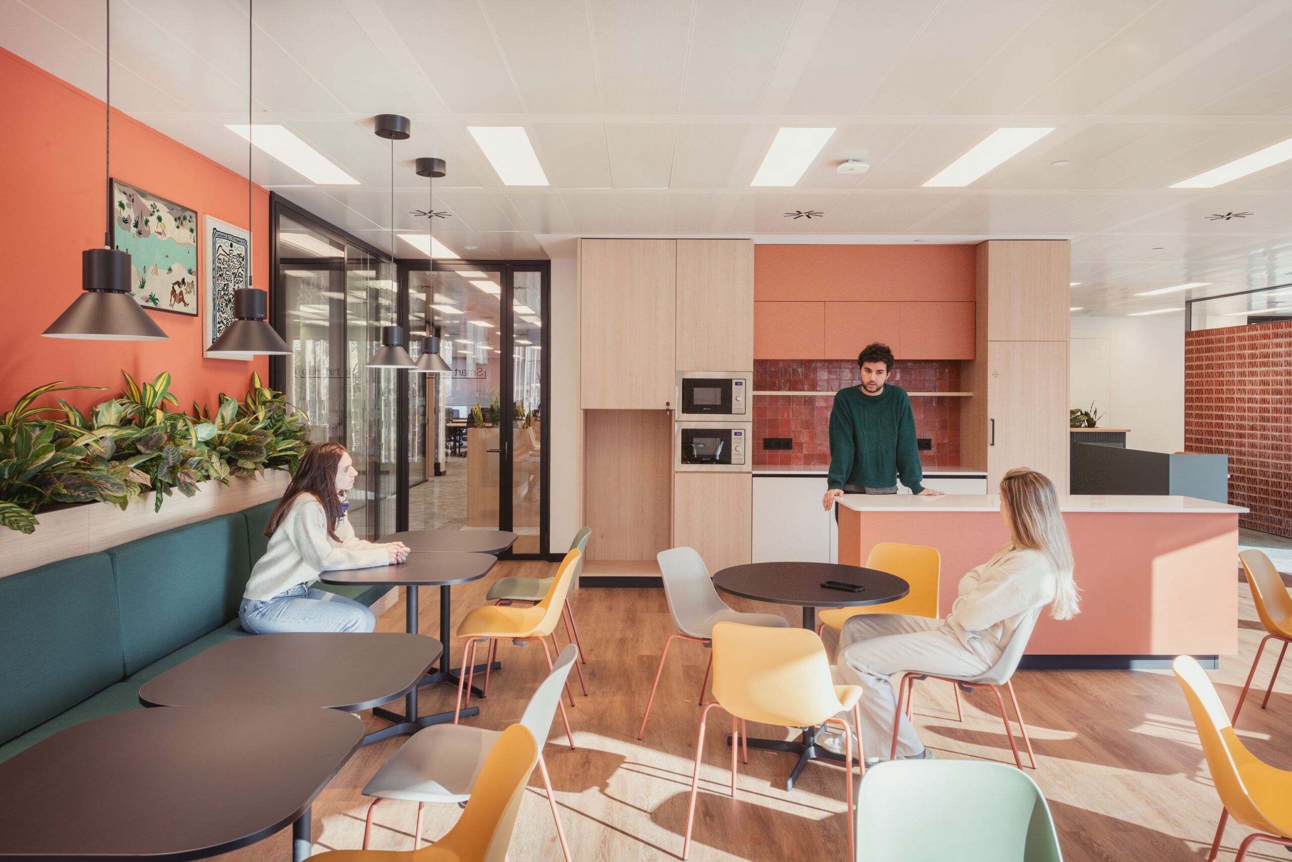 Un espacio flexible en el que hacer una pausa, tomar un café o comer. Permite reuniones informales de mayor formato gracias a su flexibilidad.
